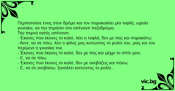 Περπατούσε ένας στον δρόμο και τον παρακαλάει μία τυφλή, ωραία γυναίκα, να την περάσει στο απέναντι πεζοδρόμιο.