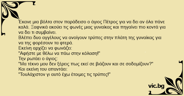 Έκανε μια βόλτα στον παράδεισο ο άγιος Πέτρος για να δει αν όλα πάνε καλά. Ξαφνικά ακούει τις φωνές μιας γυναίκας και πηγαίνει πιο κοντά για να δει τι συμβαίνει.