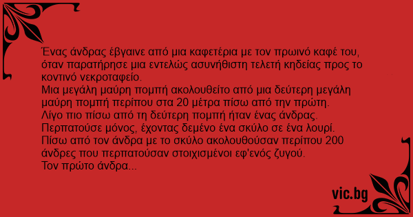 Un barbat lua micul dejun la ora 8 dimineata, un sandvis si o cafea, cand vede trecand pe strada o procesiune de inmormantare foarte neobisnuita. Un sicriu negru mare era urmat la cativa pasi de un...