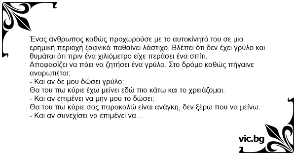 Ένας άνθρωπος καθώς προχωρούσε με το αυτοκίνητό του σε μια ερημική περιοχή ξαφνικά παθαίνει λάστιχο. Βλέπει ότι δεν έχει γρύλο και θυμάται ότι πριν ένα χιλιόμετρο είχε περάσει ένα σπίτι.
