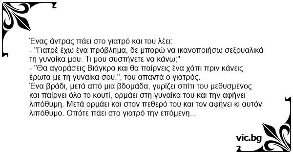 - "Θα αγοράσεις Βιάγκρα και θα παίρνεις ένα χάπι πριν κάνεις έρωτα με τη γυναίκα σου.", του απαντά ο γιατρός.