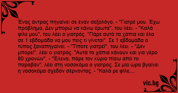 Ένας άντρας πηγαίνει σε έναν σεξολόγο. - "Γιατρέ μου. Έχω πρόβλημα. Δεν μπορώ να κάνω έρωτα", του λέει. - "Καλά φίλε μου", του λέει ο γιατρός. "Πάρε αυτά τα χάπια και έλα σε 1 εβδομάδα να μου πεις τι γίνεται". Σε 1 εβδομάδα ο τύπος ξαναπηγαίνει. - "Τίποτε γιατρέ!", του λέει. - "Δεν μπορεί", λέει ο γιατρός. "Αυτά τα χάπια κάνουν και για γέρο 80 χρονών". - "Έλενα, πάρε τον κύριο πίσω από το παραβάν", λέει στη νοσοκόμα ο γιατρός. Σε μία ώρα βγαίνει η νοσοκόμα σχεδόν σέρνοντας. - "Καλά ρε φίλε, με δουλεύεις; Εδώ κόντεψες να την πεθάνεις την νοσοκόμα. Τι δεν μπορείς να κάνεις έρωτα μου λες;», λέει ο γιατρός. Και ο τύπος: