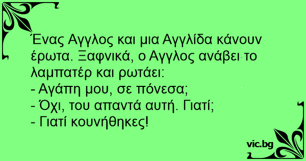 Ένας Αγγλος και μια Αγγλίδα κάνουν έρωτα. Ξαφνικά, ο Αγγλος ανάβει το λαμπατέρ και ρωτάει:
