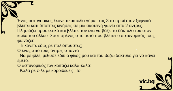 Ένας αστυνομικός έκανε περιπολία γύρω στις 3 το πρωί όταν ξαφνικά βλέπει κάτι ύποπτες κινήσεις σε μια σκοτεινή γωνία από 2 άντρες. Πλησιάζει προσεκτικά και βλέπει τον ένα να βάζει το δάκτυλο του στον κώλο του άλλου. Σαστισμένος από αυτό που βλέπει ο αστυνομικός τους φωνάζει: