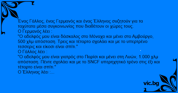 "Ο αδελφός μου είναι γιατρός στο Παρίσι και μένει στη Λυών, 1.000 χλμ απόσταση. Πέντε σχολάει και με το SNCF υπερηχητικό τρένο στις έξι και τέταρτο είναι σπίτι."