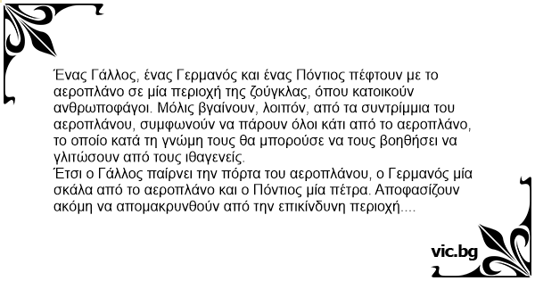 Ένας Γάλλος, ένας Γερμανός και ένας Πόντιος πέφτουν με το αεροπλάνο σε μία περιοχή της ζούγκλας, όπου κατοικούν ανθρωποφάγοι. Μόλις βγαίνουν, λοιπόν, από τα συντρίμμια του αεροπλάνου, συμφωνούν να πάρουν όλοι κάτι από το αεροπλάνο, το οποίο κατά τη γνώμη τους θα μπορούσε να τους βοηθήσει να γλιτώσουν από τους ιθαγενείς.
