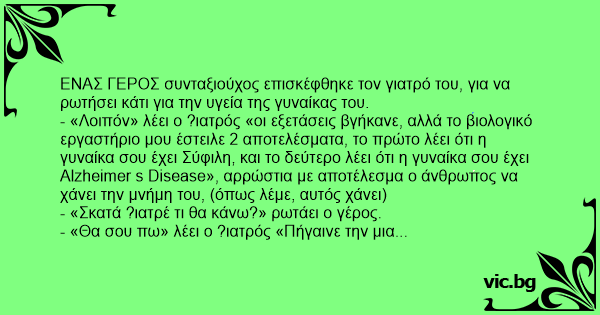 - «Λοιπόν» λέει ο ?ιατρός «οι εξετάσεις βγήκανε, αλλά το βιολογικό εργαστήριο μου έστειλε 2 αποτελέσματα, το πρώτο λέει ότι η γυναίκα σου έχει Σύφιλη, και το δεύτερο λέει ότι η γυναίκα σου έχει Alzheimer s Disease», αρρώστια με αποτέλεσμα ο άνθρωπος να χάνει την μνήμη του, (όπως λέμε, αυτός χάνει)
