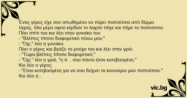 Ένας γέρος είχε σαν απωθημένο να πάρει παπούτσια από δέρμα τίγρης. Μια μέρα αφού κέρδισε το λαχείο πήγε και πήρε τα παπούτσια. Πάει σπίτι του και λέει στην γυναίκα του: