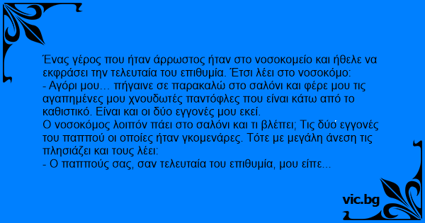 Ένας γέρος που ήταν άρρωστος ήταν στο νοσοκομείο και ήθελε να εκφράσει την τελευταία του επιθυμία. Έτσι λέει στο νοσοκόμο: