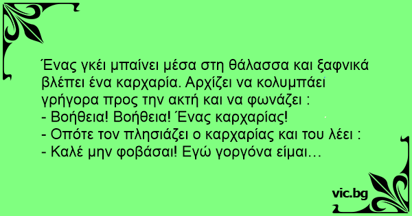 Ένας γκέι μπαίνει μέσα στη θάλασσα και ξαφνικά βλέπει ένα καρχαρία. Αρχίζει να κολυμπάει γρήγορα προς την ακτή και να φωνάζει :