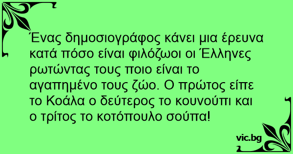 Ένας δημοσιογράφος κάνει μια έρευνα κατά πόσο είναι φιλόζωοι οι Έλληνες ρωτώντας τους ποιο είναι το αγαπημένο τους ζώο. Ο πρώτος είπε το Κοάλα ο δεύτερος το κουνούπι και ο τρίτος το κοτόπουλο σούπα!