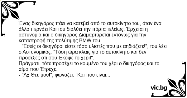 - "Εσείς οι δικηγόροι είστε τόσο υλιστές που με αηδιάζετε!", του λέει ο Αστυνομικός. "Τόση ώρα κλαις για το αυτοκίνητο και δεν πρόσεξες ότι σου Έκοψε το χέρι!".