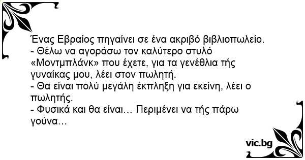 - Θέλω να αγοράσω τον καλύτερο στυλό «Μοντμπλάνκ» που έχετε, για τα γενέθλια τής γυναίκας μου, λέει στον πωλητή.