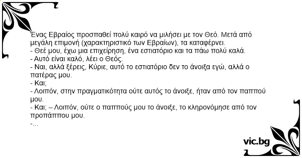 Ένας Εβραίος προσπαθεί πολύ καιρό να μιλήσει με τον Θεό. Μετά από μεγάλη επιμονή (χαρακτηριστικό των Εβραίων), τα καταφέρνει.