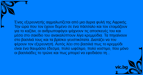 Την ώρα που τον έχουν δεμένο σε ένα πάσσαλο και τον ετοιμάζουν για το καζάνι, οι ανθρωποφάγοι ψάχνουν τις αποσκευές του και μέσα στο σακίδιο του ανακαλύπτουν λίγα κρεμμύδια. Τα πηγαίνουν στο βασιλιά τους και τα βρίσκει γευστικότατα. Διατάζει να του φέρουν τον εξερευνητή. Αυτός λέει στο βασιλιά πως το κρεμμύδι είναι ένα θαυμάσιο έδεσμα, πολύ ωφέλιμο, πολύ νοστιμο, που μόνο οι βασιλιάδες το τρώνε και πως μπορεί να εφοδιάσει τη φυλή του με άφθονα κρεμμύδια αν τον αφήσουν ελεύθερο.