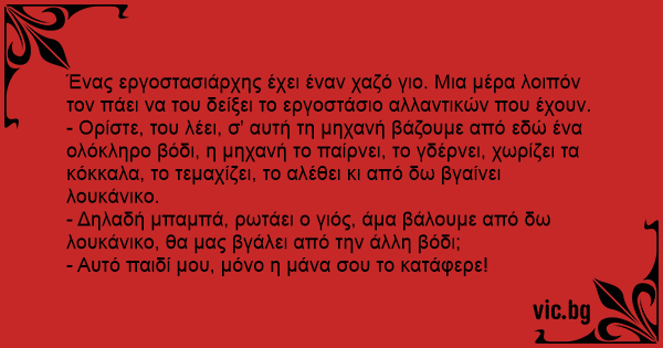 - Ορίστε, του λέει, σ' αυτή τη μηχανή βάζουμε από εδώ ένα ολόκληρο βόδι, η μηχανή το παίρνει, το γδέρνει, χωρίζει τα κόκκαλα, το τεμαχίζει, το αλέθει κι από δω βγαίνει λουκάνικο.