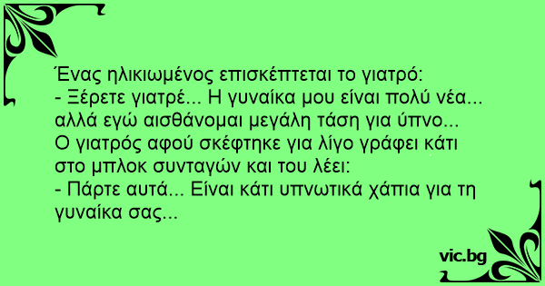 - Ξέρετε γιατρέ... Η γυναίκα μου είναι πολύ νέα... αλλά εγώ αισθάνομαι μεγάλη τάση για ύπνο...