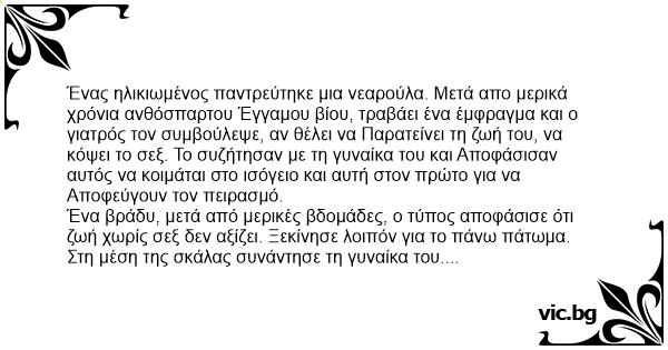 Ένας ηλικιωμένος παντρεύτηκε μια νεαρούλα. Μετά απο μερικά χρόνια ανθόσπαρτου Έγγαμου βίου, τραβάει ένα έμφραγμα και ο γιατρός τον συμβούλεψε, αν θέλει να Παρατείνει τη ζωή του, να κόψει το σεξ. Το συζήτησαν με τη γυναίκα του και Αποφάσισαν αυτός να κοιμάται στο ισόγειο και αυτή στον πρώτο για να Αποφεύγουν τον πειρασμό.