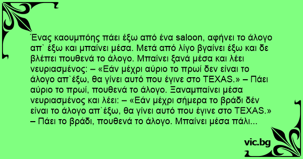 Ένας καουμπόης πάει έξω από ένα saloon, αφήνει το άλογο απ` έξω και μπαίνει μέσα. Μετά από λίγο βγαίνει έξω και δε βλέπει πουθενά το άλογο. Μπαίνει ξανά μέσα και λέει νευριασμένος: – «Εάν μέχρι αύριο το πρωί δεν είναι το άλογο απ`έξω, θα γίνει αυτό που έγινε στο TEXAS.» – Πάει αύριο το πρωί, πουθενά το άλογο. Ξαναμπαίνει μέσα νευριασμένος και λέει: – «Εάν μέχρι σήμερα το βράδι δέν είναι το άλογο απ`έξω, θα γίνει αυτό που έγινε στο TEXAS.» – Πάει το βράδι, πουθενά το άλογο. Μπαίνει μέσα πάλι νευριασμένος και λέει: – «Αν δεν είναι το άλογο έξω μέχρι αύριο το πρωί, θα γίνει αυτό που έγινε στο TEXAS.» – Πάει ένας και τον ρωτάει: – «Καλά ρε φίλε, τι έγινε στο TEXAS;» – «Έφυγα με τα πόδια.»