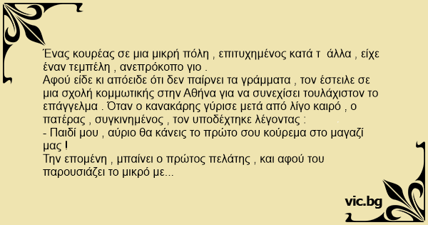 - Aντε παιδί μου , λέει ο κουρέας στο γιο , δείξε μου τι έμαθες !