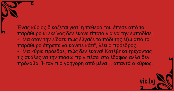 - "Μα κύριε πρόεδρε, πώς δεν έκανα! Κατέβηκα τρέχοντας τις σκάλες να την πιάσω πριν πέσει στο έδαφος αλλά δεν πρόλαβα. Ήταν πιο γρήγορη από μένα.", απαντά ο κύριος.