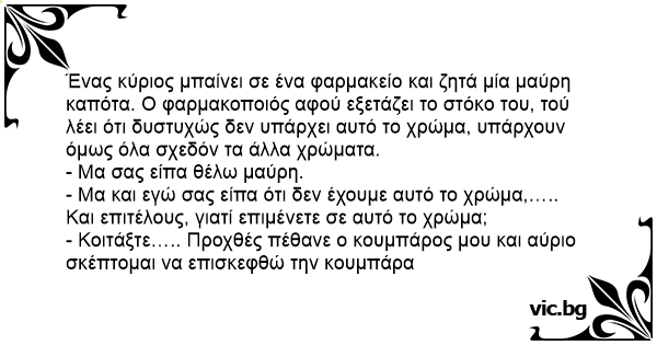 Ένας κύριος μπαίνει σε ένα φαρμακείο και ζητά μία μαύρη καπότα. Ο φαρμακοποιός αφού εξετάζει το στόκο του, τού λέει ότι δυστυχώς δεν υπάρχει αυτό το χρώμα, υπάρχουν όμως όλα σχεδόν τα άλλα χρώματα.