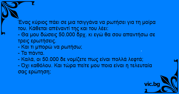 Ένας κύριος πάει σε μια τσιγγάνα να ρωτήσει για τη μοίρα του. Κάθεται απέναντί της και του λέει: