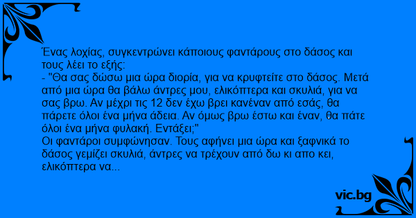 - "Θα σας δώσω μια ώρα διορία, για να κρυφτείτε στο δάσος. Μετά από μια ώρα θα βάλω άντρες μου, ελικόπτερα και σκυλιά, για να σας βρω. Αν μέχρι τις 12 δεν έχω βρει κανέναν από εσάς, θα πάρετε όλοι ένα μήνα άδεια. Αν όμως βρω έστω και έναν, θα πάτε όλοι ένα μήνα φυλακή. Εντάξει;"