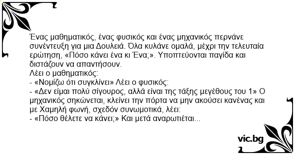Ένας μαθηματικός, ένας φυσικός και ένας μηχανικός περνάνε συνέντευξη για μια Δουλειά. Όλα κυλάνε ομαλά, μέχρι την τελευταία ερώτηση, «Πόσο κάνει ένα κι Ένα;». Υποπτεύονται παγίδα και διστάζουν να απαντήσουν.