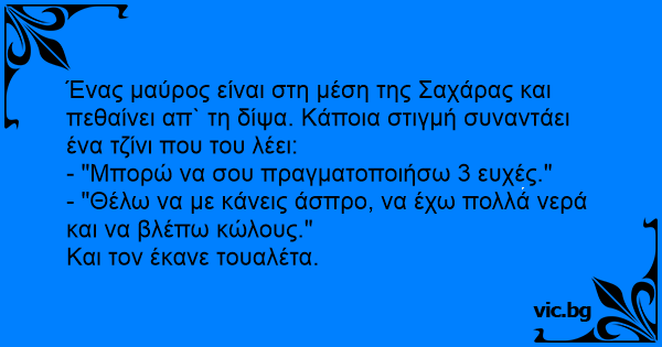 Ένας μαύρος είναι στη μέση της Σαχάρας και πεθαίνει απ` τη δίψα. Κάποια στιγμή συναντάει ένα τζίνι που του λέει: