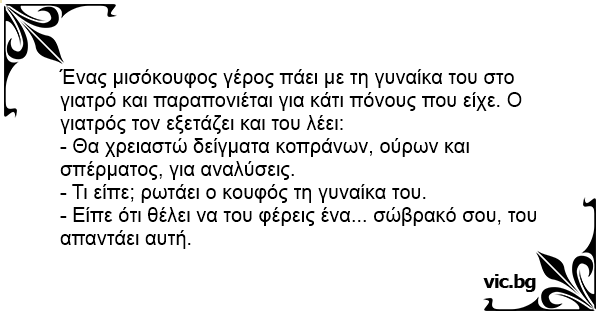 Ett äldre par kommer in på sjukhuset och får träffa doktorn. Denne säger till mannen: - Du får lämna urinprov, avföringsprov och blodprov. Mannen stirrar på doktorn och säger: - Va sa du???...