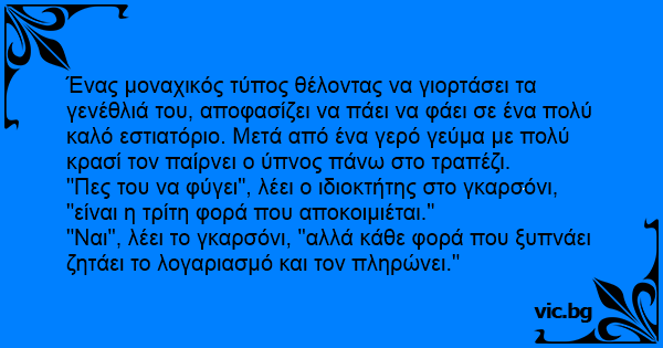"Ναι", λέει το γκαρσόνι, "αλλά κάθε φορά που ξυπνάει ζητάει το λογαριασμό και τον πληρώνει."