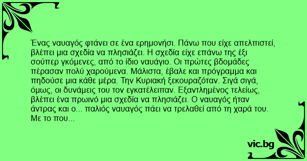 Ένας ναυαγός φτάνει σε ένα ερημονήσι. Πάνω που είχε απελπιστεί, βλέπει μια σχεδία να πλησιάζει. Η σχεδία είχε επάνω της έξι σούπερ γκόμενες, από το ίδιο ναυάγιο. Οι πρώτες βδομάδες πέρασαν πολύ χαρούμενα. Μάλιστα, έβαλε και πρόγραμμα και πηδούσε μια κάθε μέρα. Την Κυριακή ξεκουραζόταν. Σιγά σιγά, όμως, οι δυνάμεις του τον εγκατέλειπαν. Εξαντλημένος τελείως, βλέπει ένα πρωινό μια σχεδία να πλησιάζει. Ο ναυαγός ήταν άντρας και ο... παλιός ναυαγός πάει να τρελαθεί από τη χαρά του.