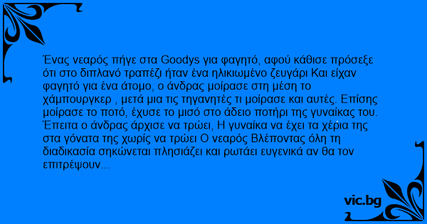 Ένας νεαρός πήγε στα Goodys για φαγητό, αφού κάθισε πρόσεξε ότι στο διπλανό τραπέζι ήταν ένα ηλικιωμένο ζευγάρι Και είχαν φαγητό για ένα άτομο, ο άνδρας μοίρασε στη μέση το χάμπουργκερ , μετά μια τις τηγανητές τι μοίρασε και αυτές. Επίσης μοίρασε το ποτό, έχυσε το μισό στο άδειο ποτήρι της γυναίκας του.