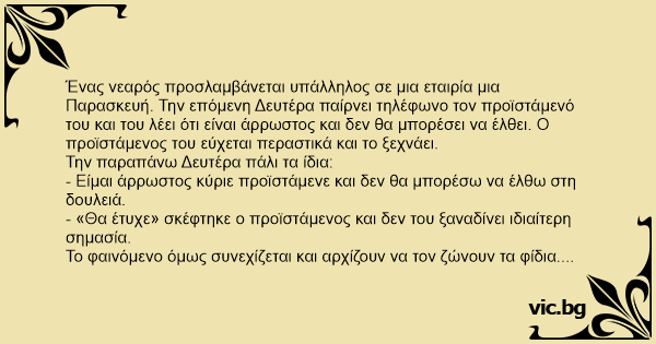 Ένας νεαρός προσλαμβάνεται υπάλληλος σε μια εταιρία μια Παρασκευή. Την επόμενη Δευτέρα παίρνει τηλέφωνο τον προϊστάμενό του και του λέει ότι είναι άρρωστος και δεν θα μπορέσει να έλθει. Ο προϊστάμενος του εύχεται περαστικά και το ξεχνάει.