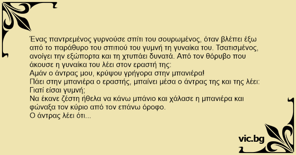 Ένας παντρεμένος γυρνούσε σπίτι του σουρωμένος, όταν βλέπει έξω από το παράθυρο του σπιτιού του γυμνή τη γυναίκα του. Τσατισμένος, ανοίγει την εξώπορτα και τη χτυπάει δυνατά. Από τον θόρυβο που άκουσε η γυναίκα του λέει στον εραστή της: