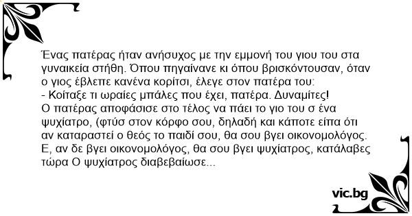 Ο πατέρας αποφάσισε στο τέλος να πάει το γιο του σ ένα ψυχίατρο, (φτύσ στον κόρφο σου, δηλαδή και κάποτε είπα ότι αν καταραστεί ο θεός το παιδί σου, θα σου βγει οικονομολόγος. Ε, αν δε βγει οικονομολόγος, θα σου βγει ψυχίατρος, κατάλαβες τώρα Ο ψυχίατρος διαβεβαίωσε τον πατέρα ότι, με εντατική θεραπεία, θα το διόρθωνε το κουσούρι του γιου.