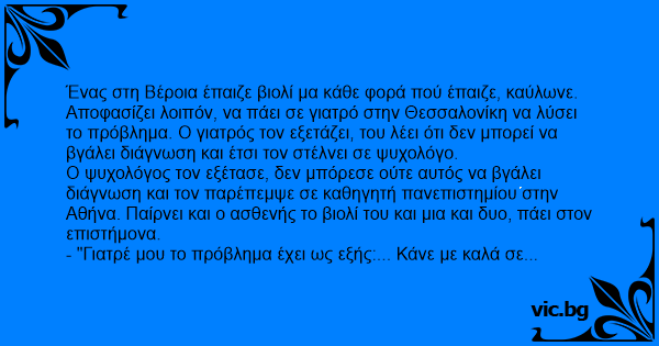 Ένας στη Βέροια έπαιζε βιολί μα κάθε φορά πού έπαιζε, καύλωνε. Αποφασίζει λοιπόν, να πάει σε γιατρό στην Θεσσαλονίκη να λύσει το πρόβλημα. Ο γιατρός τον εξετάζει, του λέει ότι δεν μπορεί να βγάλει διάγνωση και έτσι τον στέλνει σε ψυχολόγο.