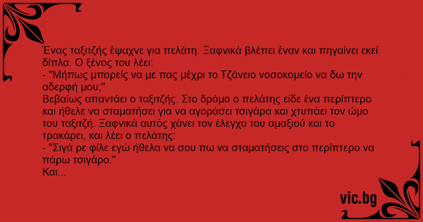 Βεβαίως απαντάει ο ταξιτζής. Στο δρόμο ο πελάτης είδε ένα περίπτερο και ήθελε να σταματήσει για να αγοράσει τσιγάρα και χτυπάει τον ώμο του ταξιτζή. Ξαφνικά αυτός χάνει τον έλεγχο του αμαξιού και το τρακάρει, και λέει ο πελάτης: