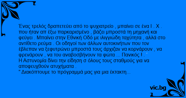 Ένας τρελός δραπετεύει από το ψυχιατρείο , μπαίνει σε ένα Ι . Χ . που ήταν απ έξω παρκαρισμένο , βάζει μπροστά τη μηχανή και φεύγει . Μπαίνει στην Εθνική Οδό με ιλιγγιώδη ταχύτητα , αλλά στο αντίθετο ρεύμα . Οι οδηγοί των άλλων αυτοκινήτων που τον έβλεπαν να ξεφυτρώνει μπροστά τους άρχιζαν να κορνάρουν , να φρενάρουν , να του αναβοσβήνουν τα φώτα ... Πανικός ! .