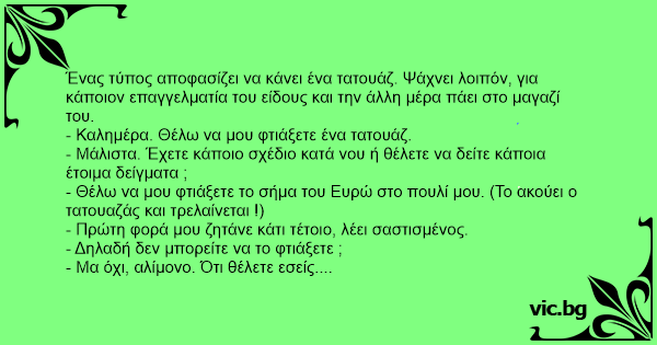 - Θέλω να μου φτιάξετε το σήμα του Ευρώ στο πουλί μου. (Το ακούει ο τατουαζάς και τρελαίνεται !)