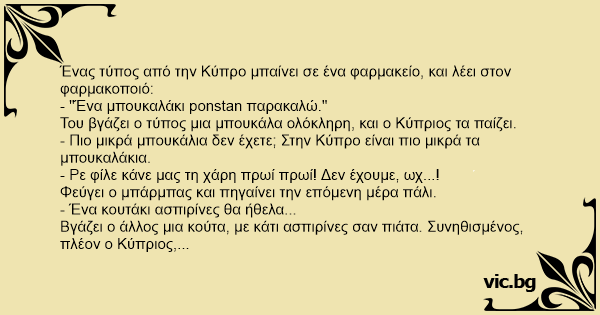 Ένας τύπος από την Κύπρο μπαίνει σε ένα φαρμακείο, και λέει στον φαρμακοποιό: