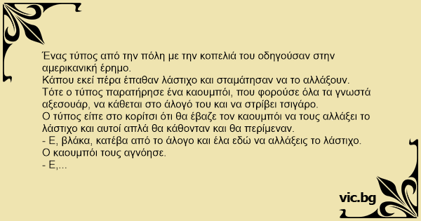 Ο τύπος είπε στο κορίτσι ότι θα έβαζε τον καουμπόι να τους αλλάξει το λάστιχο και αυτοί απλά θα κάθονταν και θα περίμεναν.