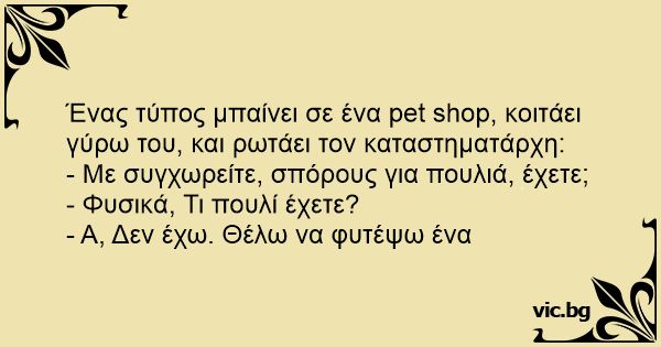 Ένας τύπος μπαίνει σε ένα pet shop, κοιτάει γύρω του, και ρωτάει τον καταστηματάρχη: