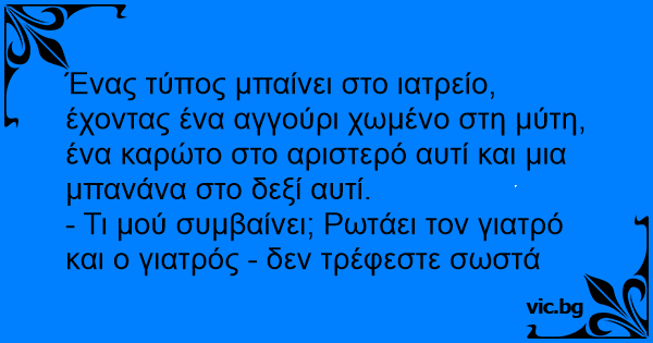 Ένας τύπος μπαίνει στο ιατρείο, έχοντας ένα αγγούρι χωμένο στη μύτη, ένα καρώτο στο αριστερό αυτί και μια μπανάνα στο δεξί αυτί.