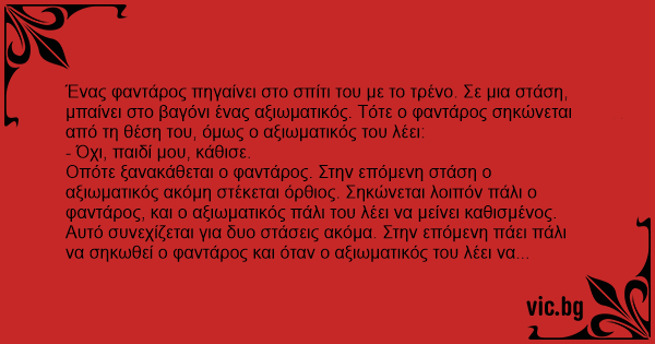 Οπότε ξανακάθεται ο φαντάρος. Στην επόμενη στάση ο αξιωματικός ακόμη στέκεται όρθιος. Σηκώνεται λοιπόν πάλι ο φαντάρος, και ο αξιωματικός πάλι του λέει να μείνει καθισμένος. Αυτό συνεχίζεται για δυο στάσεις ακόμα. Στην επόμενη πάει πάλι να σηκωθεί ο φαντάρος και όταν ο αξιωματικός του λέει να ξανακαθίσει, απαντάει: