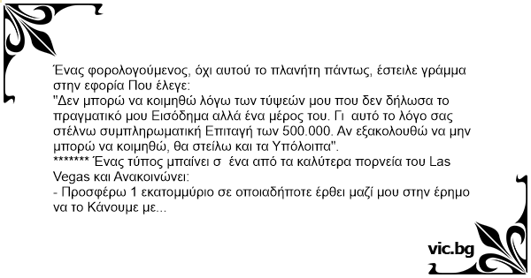 "Δεν μπορώ να κοιμηθώ λόγω των τύψεών μου που δεν δήλωσα το πραγματικό μου Εισόδημα αλλά ένα μέρος του. Γι αυτό το λόγο σας στέλνω συμπληρωματική Επιταγή των 500.000. Αν εξακολουθώ να μην μπορώ να κοιμηθώ, θα στείλω και τα Υπόλοιπα".