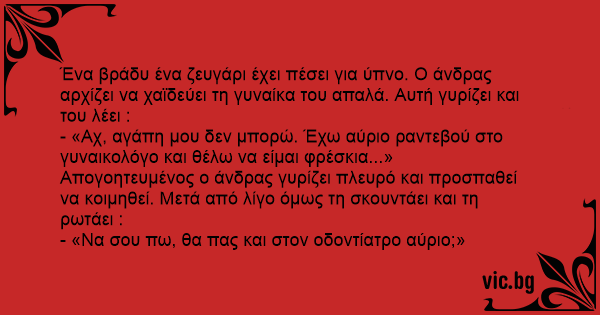 Απογοητευμένος ο άνδρας γυρίζει πλευρό και προσπαθεί να κοιμηθεί. Μετά από λίγο όμως τη σκουντάει και τη ρωτάει :