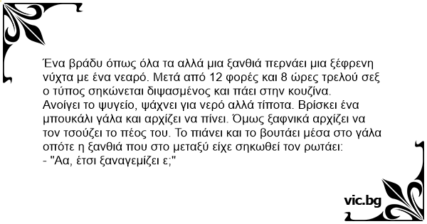 Ένα βράδυ όπως όλα τα αλλά μια ξανθιά περνάει μια ξέφρενη νύχτα με ένα νεαρό. Μετά από 12 φορές και 8 ώρες τρελού σεξ ο τύπος σηκώνεται διψασμένος και πάει στην κουζίνα. Ανοίγει το ψυγείο, ψάχνει για νερό αλλά τίποτα. Βρίσκει ένα μπουκάλι γάλα και αρχίζει να πίνει. Όμως ξαφνικά αρχίζει να τον τσούζει το πέος του. Το πιάνει και το βουτάει μέσα στο γάλα οπότε η ξανθιά που στο μεταξύ είχε σηκωθεί τον ρωτάει: - "Αα, έτσι ξαναγεμίζει ε;"