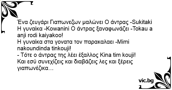 Ένα ζευγάρι Γιαπωνεζων μαλώνει Ο άντρας -Sukitaki Η γυναίκα -Kowanini Ο άντρας ξαναφωνάζει -Tokau a anji rodi kaiyakoo!